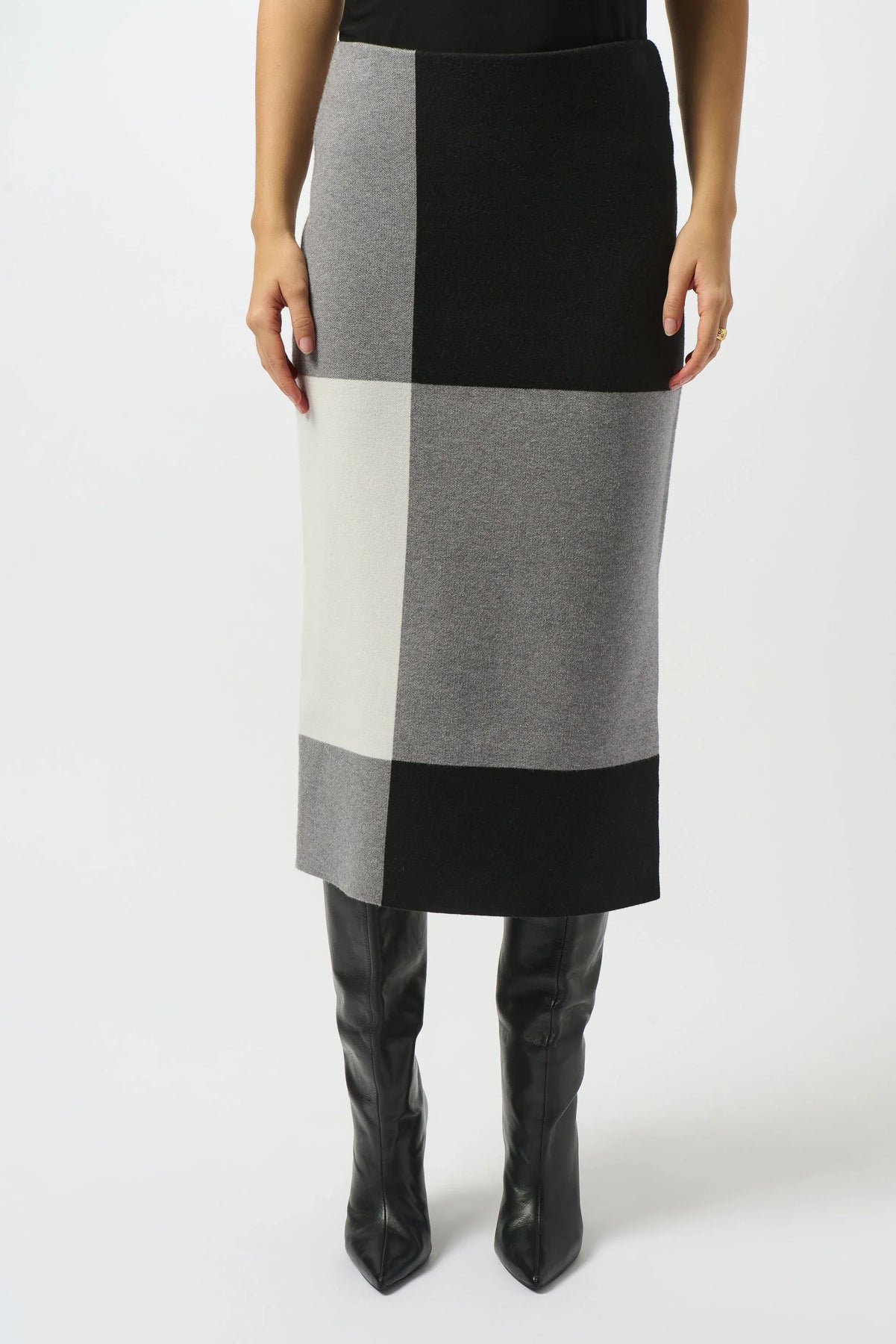 The epitome of cozy-chic, this sweater knit skirt is updated with a modern colour-block print for a fresh, stylish look. Crafted from warm jacquard knit, it offers a comfortable pull-on style with an elastic waistband for easy wear. The flattering mid-calf length makes it ideal for cooler days spent meeting friends at the coffee shop or mingling with coworkers at the office.