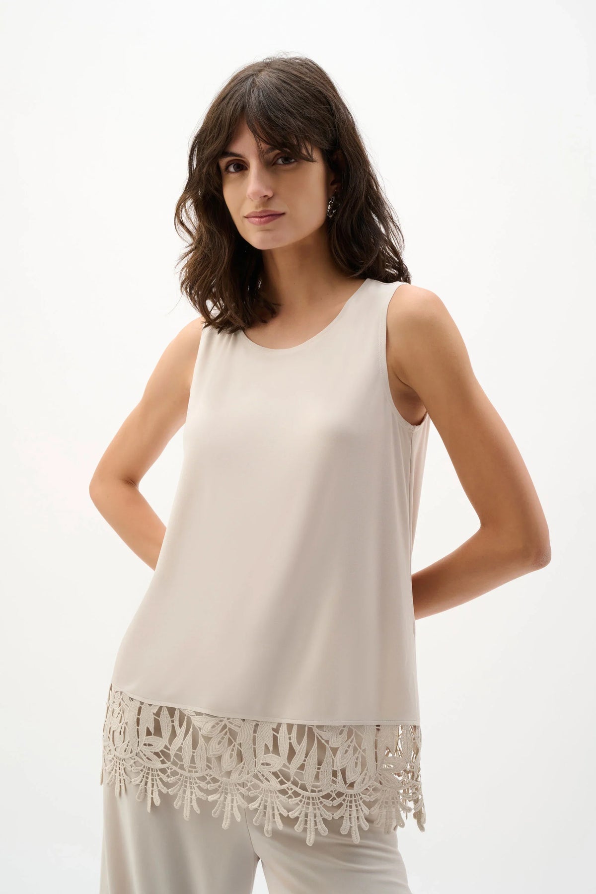 This silky knit sleeveless top is finished with a scalloped guipure lace hem, adding a touch of texture and elegance to its straight silhouette.