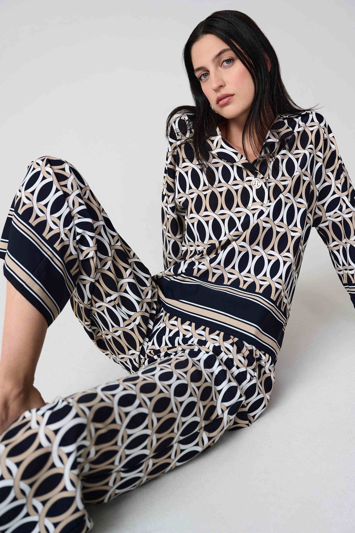 Sophisticated with a statement edge, these recycled woven pants feature a bold status chain border print, side pockets, and a comfortable shirred elastic waistband at the back.